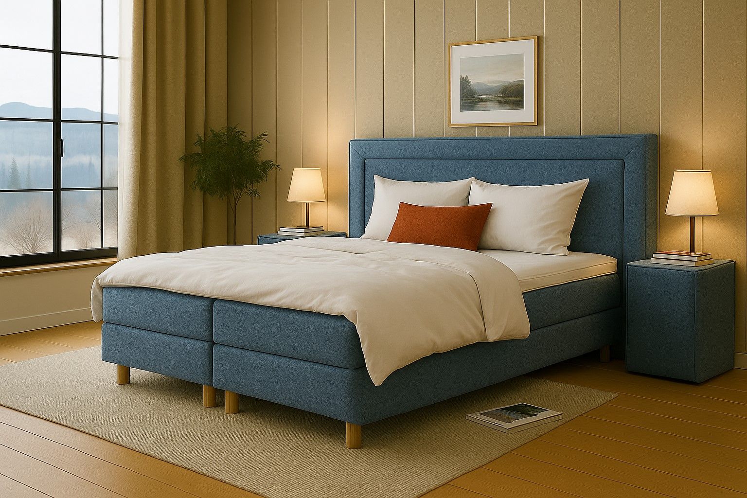 Das komfortable Boxspringbett Luxor, im typischen skandinavischen Stil, bietet Ihren Gästen ein sehr an-genehmes und kuscheliges Liegegefühl durch den 3-schichtigen Aufbau mit einem Topper. Diese Kombi-nation bietet ein besonders körperunterstützendes und damit gesundes Liegegefühl mit einem wohligen und anschmiegsamen Charakter. Die Matratze ist mit dem gleichen Polsterbezug überzogen wie der Unterbau - typisch skandinavisch. Ein Bett mit besonderem Design.